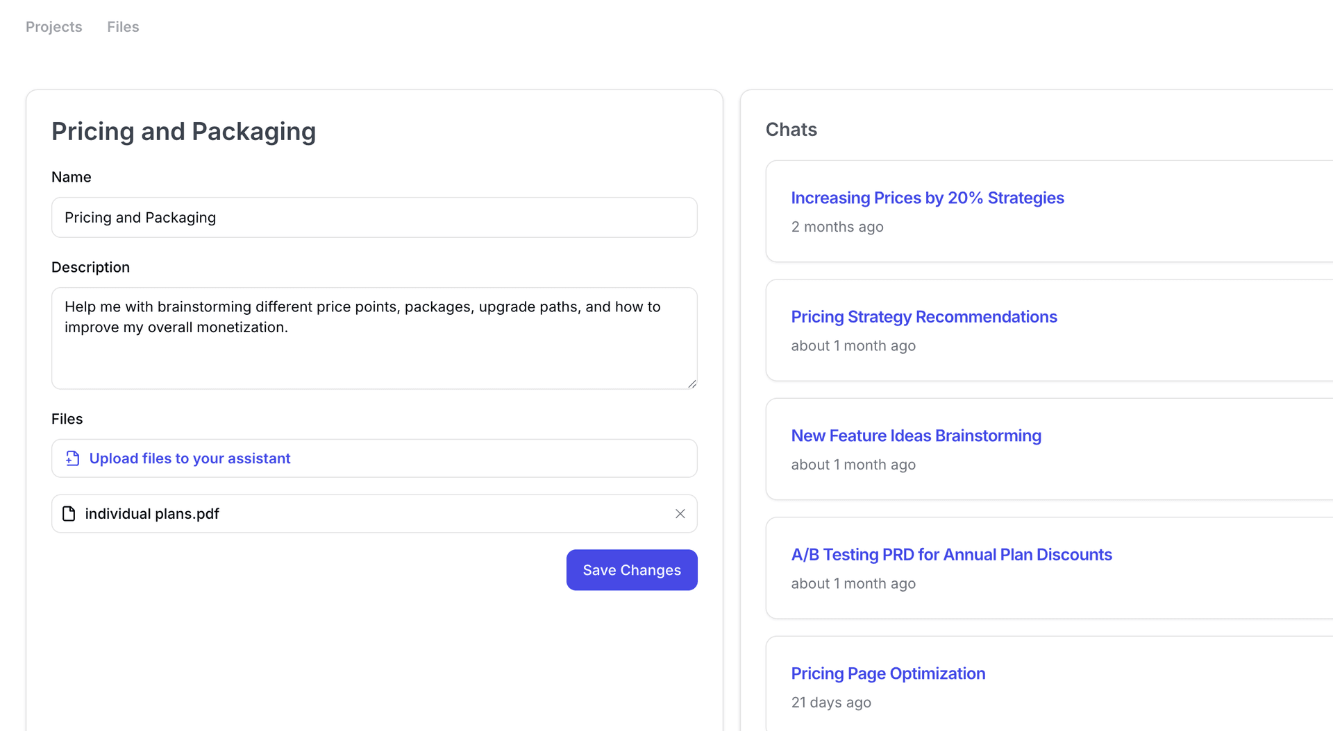 By default, all ChatPRD users have access to the ChatPRD Assistant, a general-purpose co-pilot that’s personalized to your profile. But with Projects, Pro, Teams, and Enterprise users can take it a step further by creating specialized assistants equipped with context-specific knowledge and files.