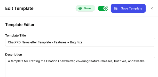 - When creating or editing a template, toggle the Share Template toggle to ON.