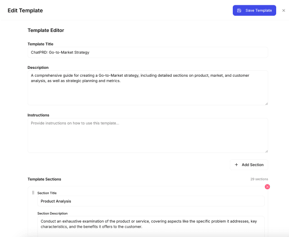 - Modify the template title, description, or sections as needed.