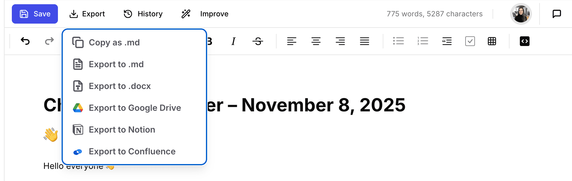 - While in a chat or document view, click on the Export button.