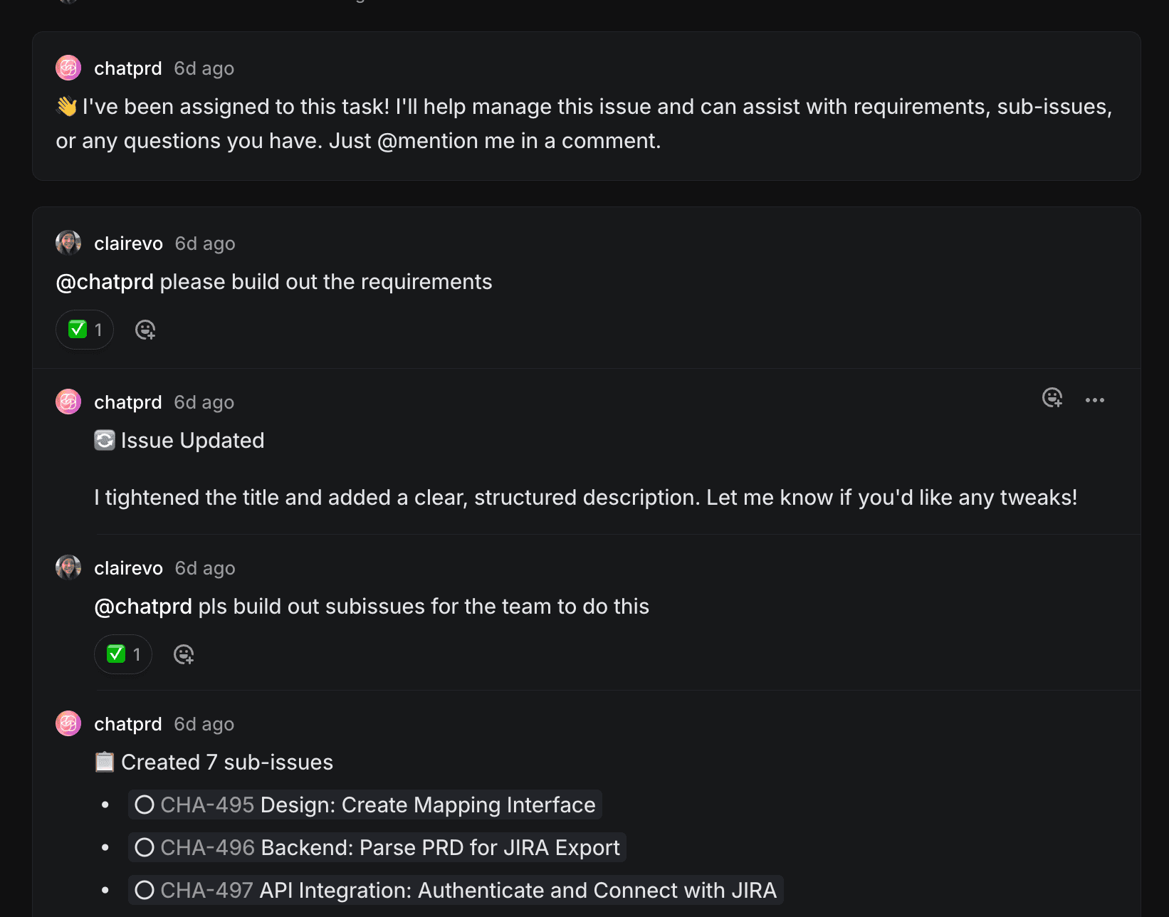 ChatPRD will post a comment introducing itself and offering to help with requirements, subtasks, or questions.