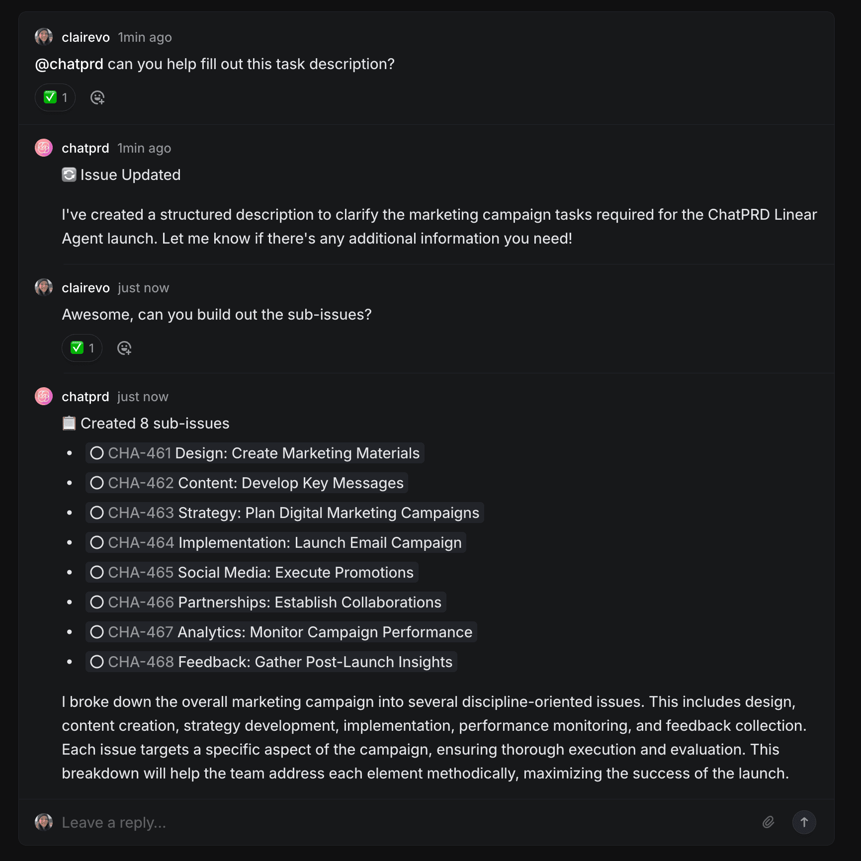 If you reply in a thread where ChatPRD has commented, it will respond to your follow-up questions or requests.