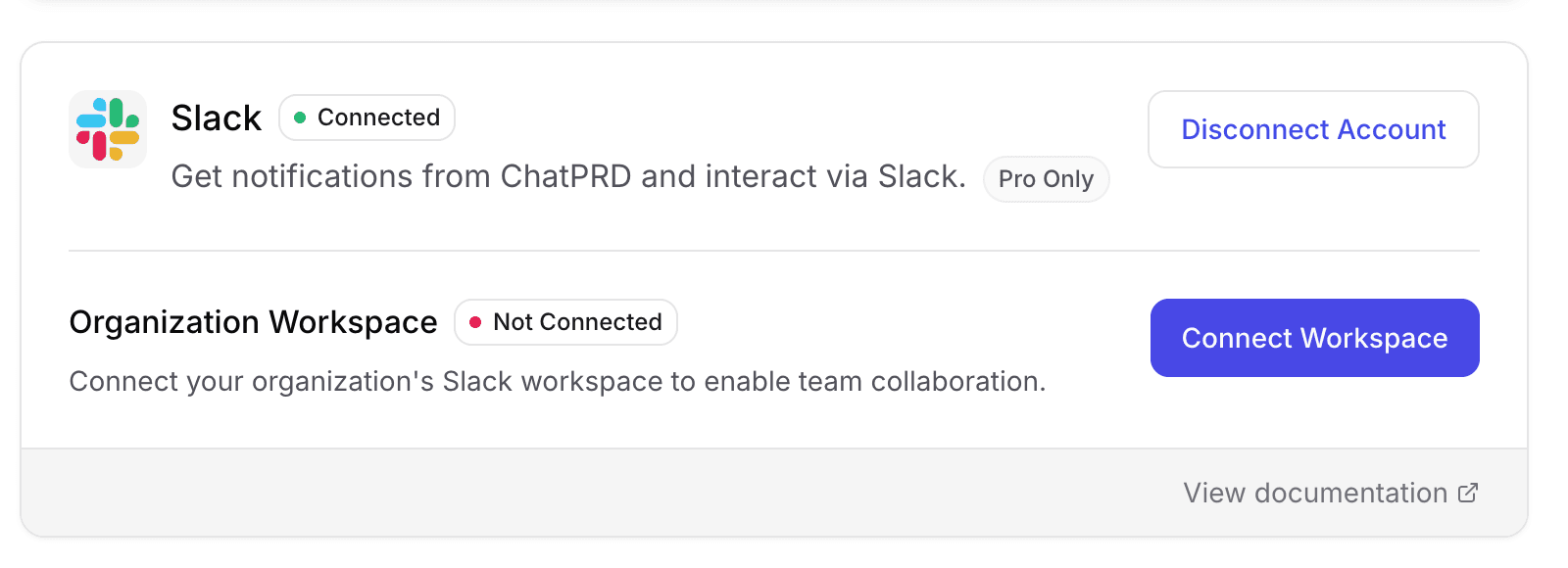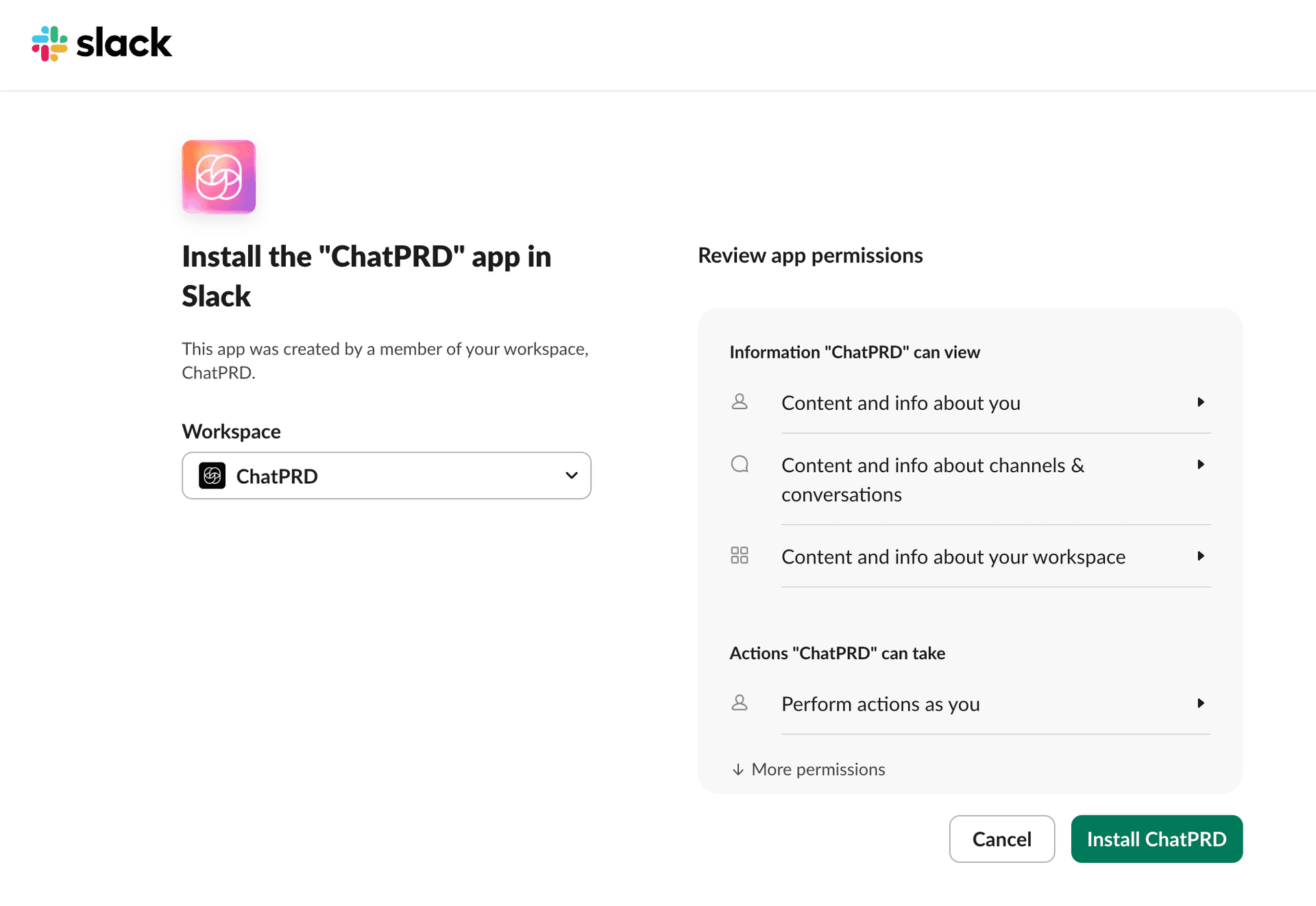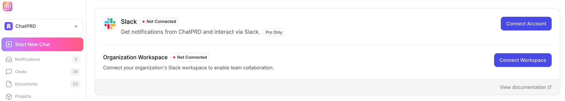 This guide explains how to set up and use the Slack integration with ChatPRD, both for personal accounts and workspace/team accounts.