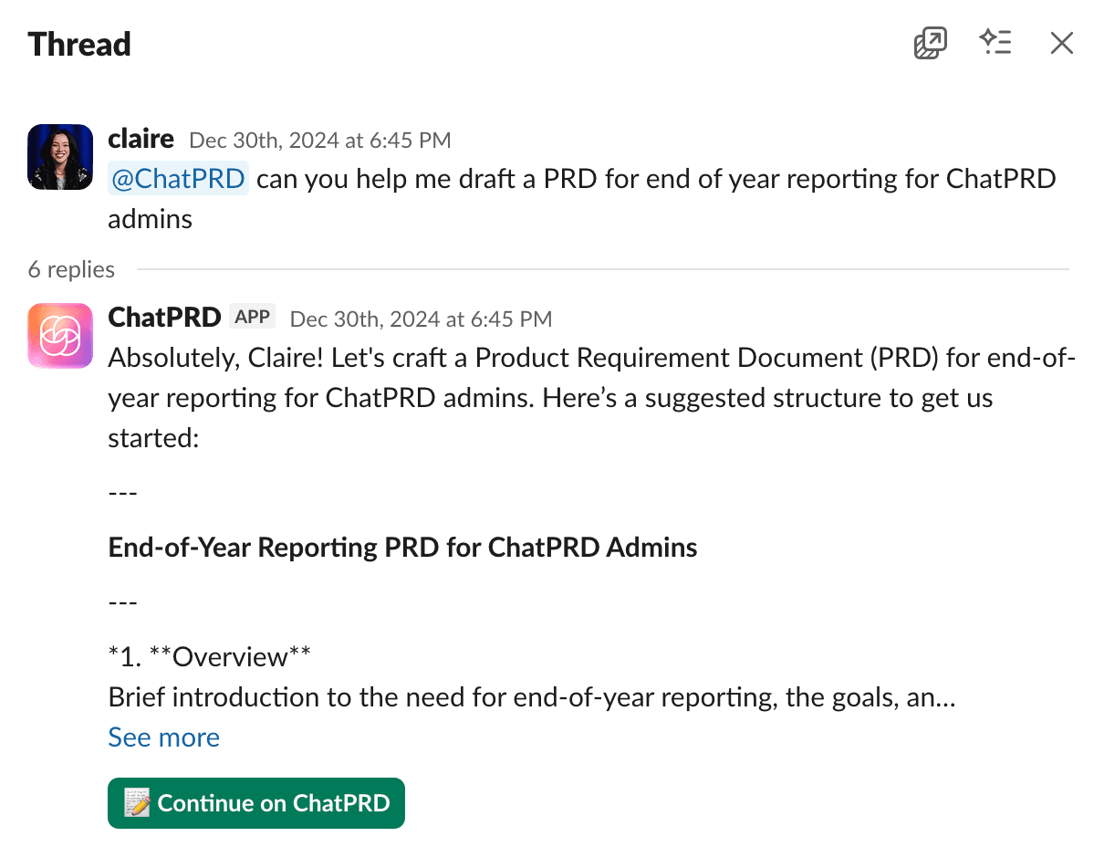 2. ChatPRD will process your request and respond directly in the Slack thread.