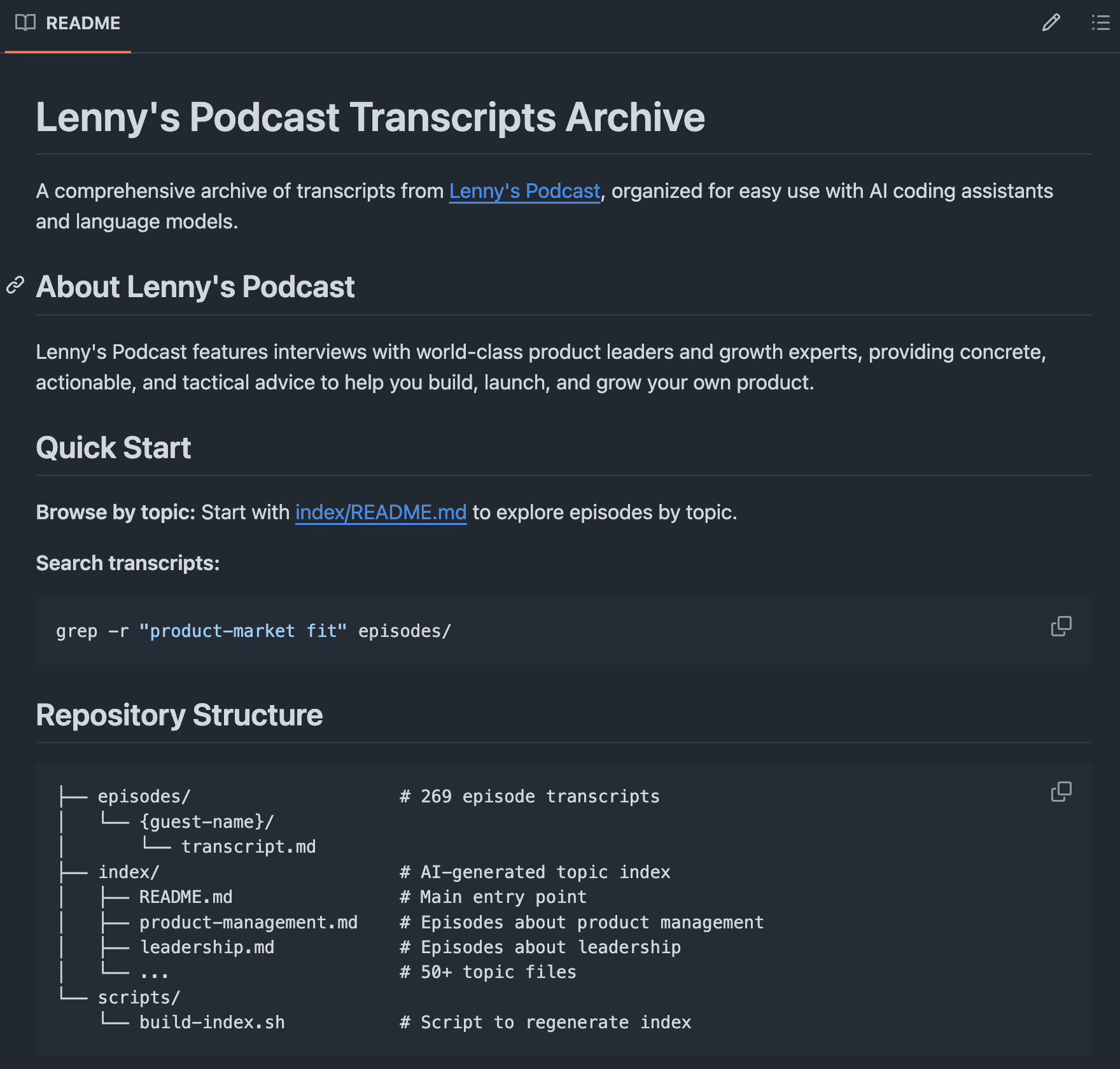 Lenny released hundreds of transcripts from his podcast, and I bundled them all into an easy to use repo for all your AI projects.