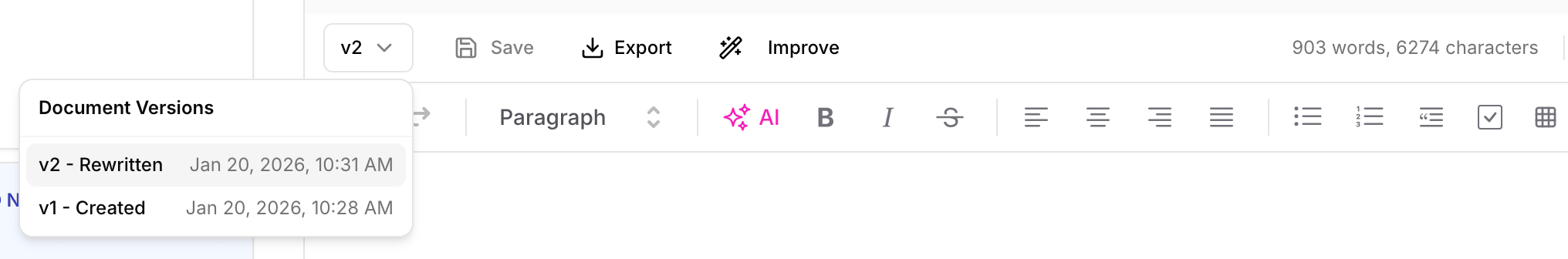 With all the edits to documents, we've gotten feedback you need better version control, so we've rolled out first-class version history for documents with ability to switch between snapshots, track AI vs manual edits, and work from historical states: