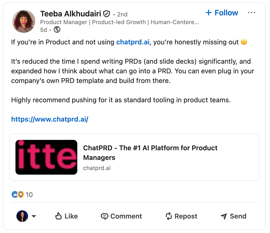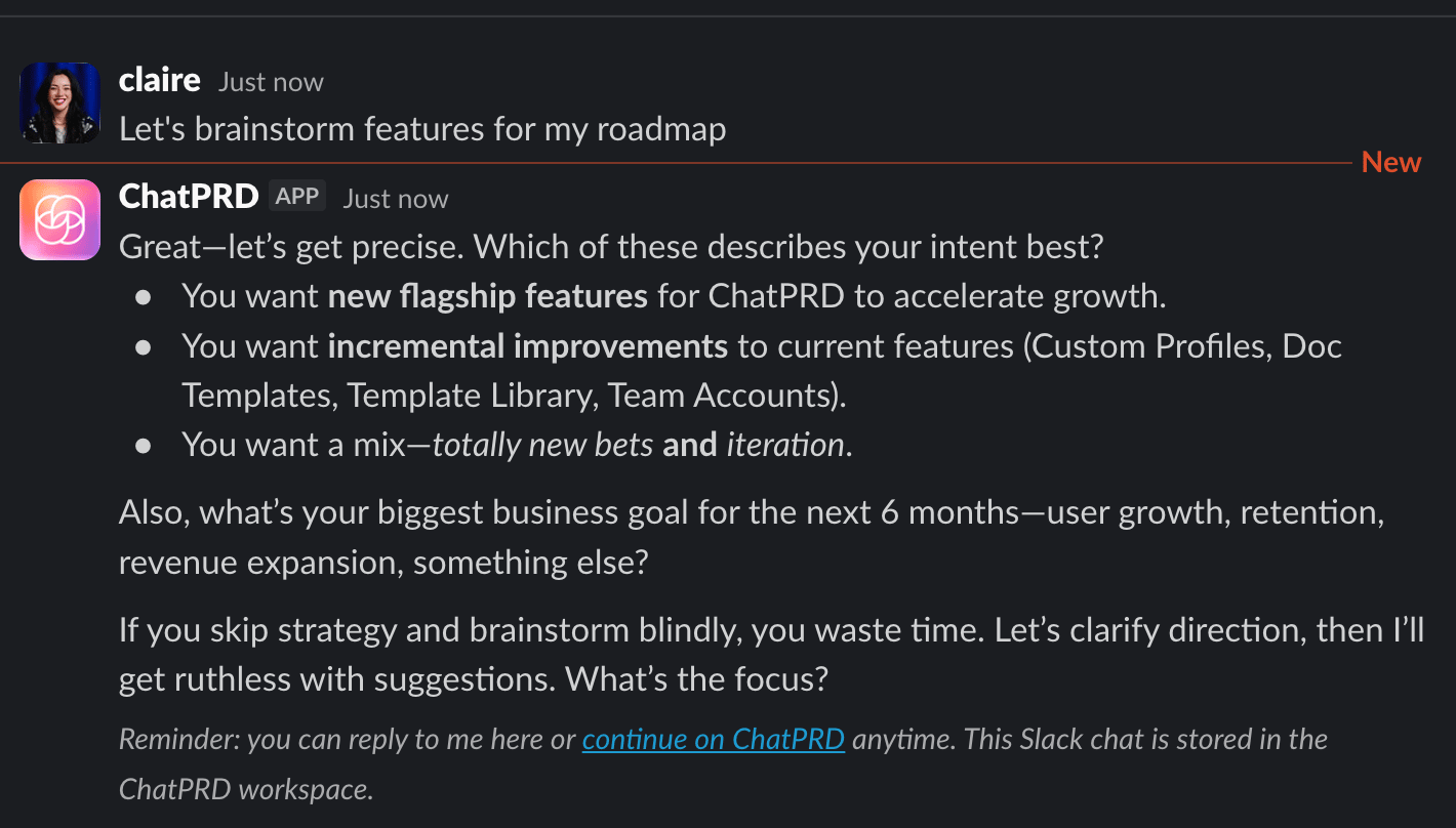 We continue to refine the ChatPRD slackbot to make her more responsive, more capable, and less buggy! If you haven't tried out Slack integration, you should give it a spin today.