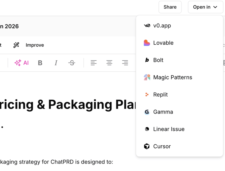 We've added an “Open in Cursor” option that generates deeplinks to open PRDs and other docs directly in Cursor IDE with document content as a prompt:
