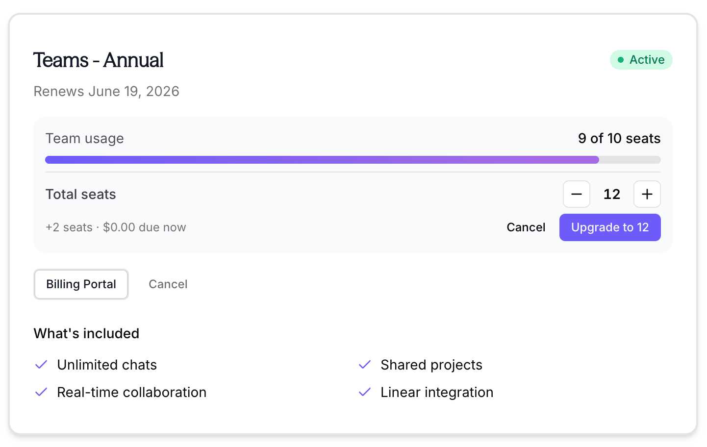 Teams plan admins can now add seats directly from Settings → Billing without leaving the app. You'll see an instant prorated price preview before confirming, so there are no surprises on your invoice.