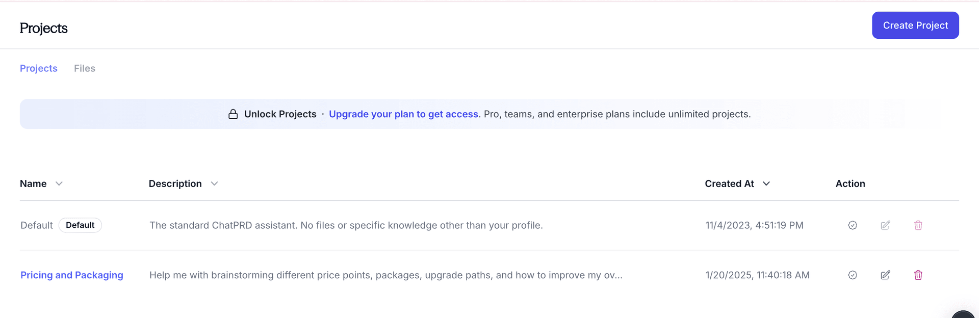 By default, all ChatPRD users have access to the ChatPRD Assistant, a general-purpose co-pilot that’s personalized to your profile. But with Projects, Pro, Teams, and Enterprise users can take it a step further by creating specialized assistants equipped with context-specific knowledge and files.