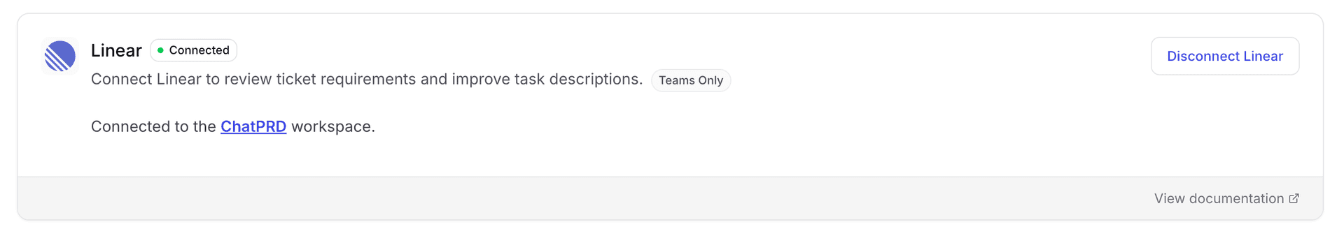 - The Linear card in ChatPRD will show your workspace name and a “Connected” badge.