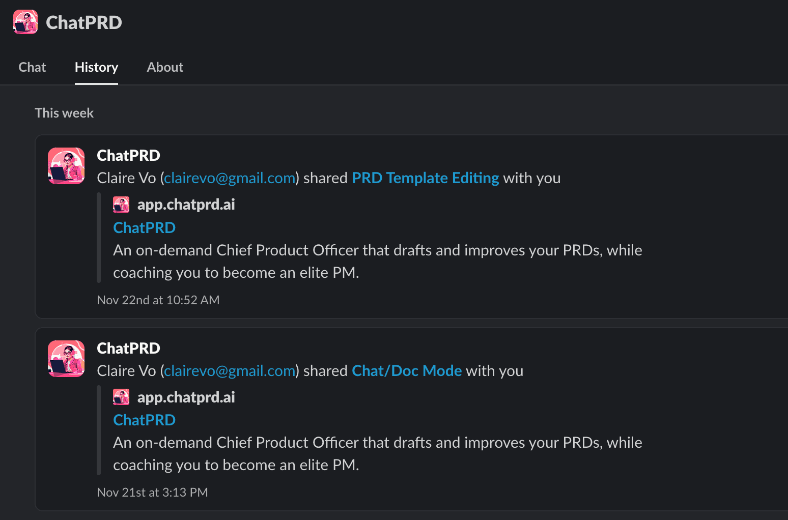 With the integration enabled, you can use ChatPRD directly from Slack: