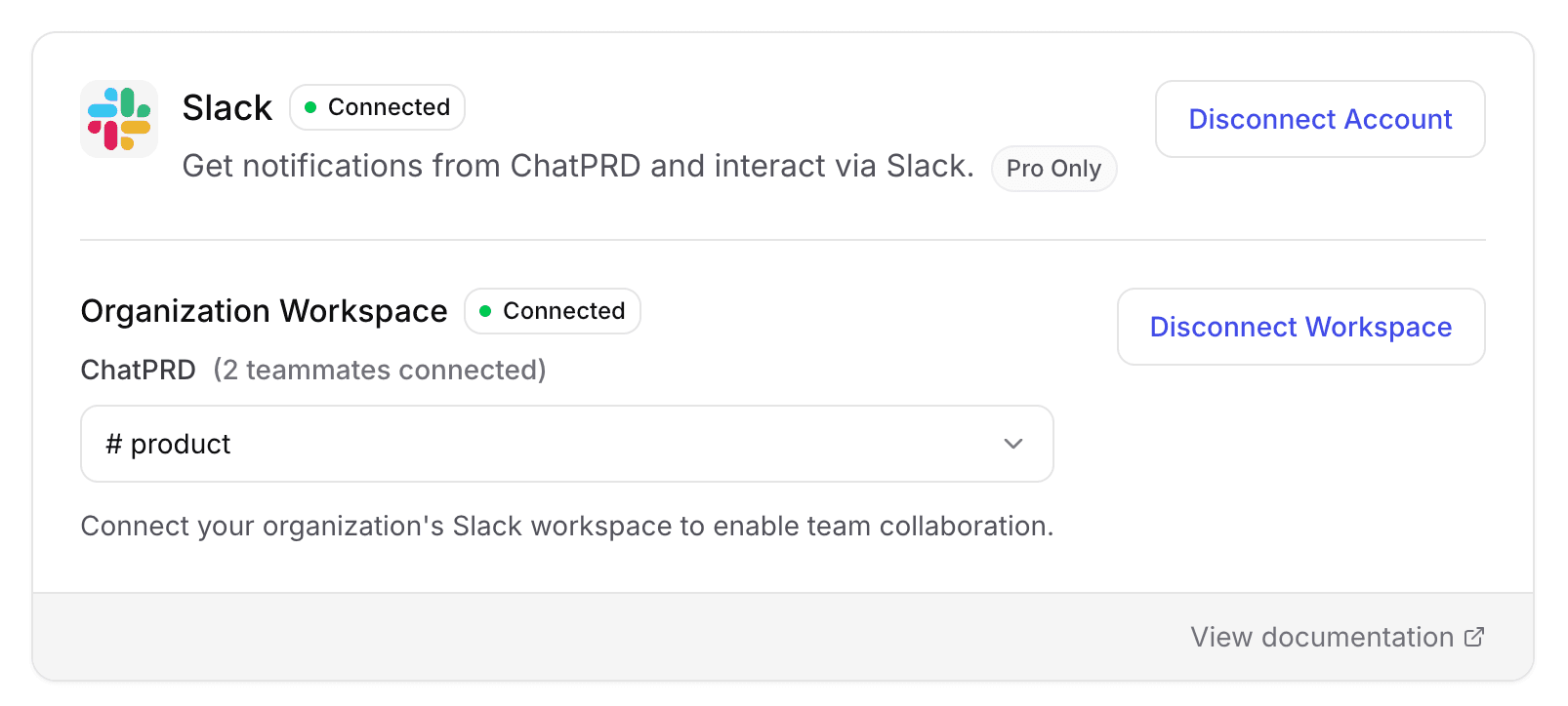 This guide explains how to set up and use the Slack integration with ChatPRD, both for personal accounts and workspace/team accounts.