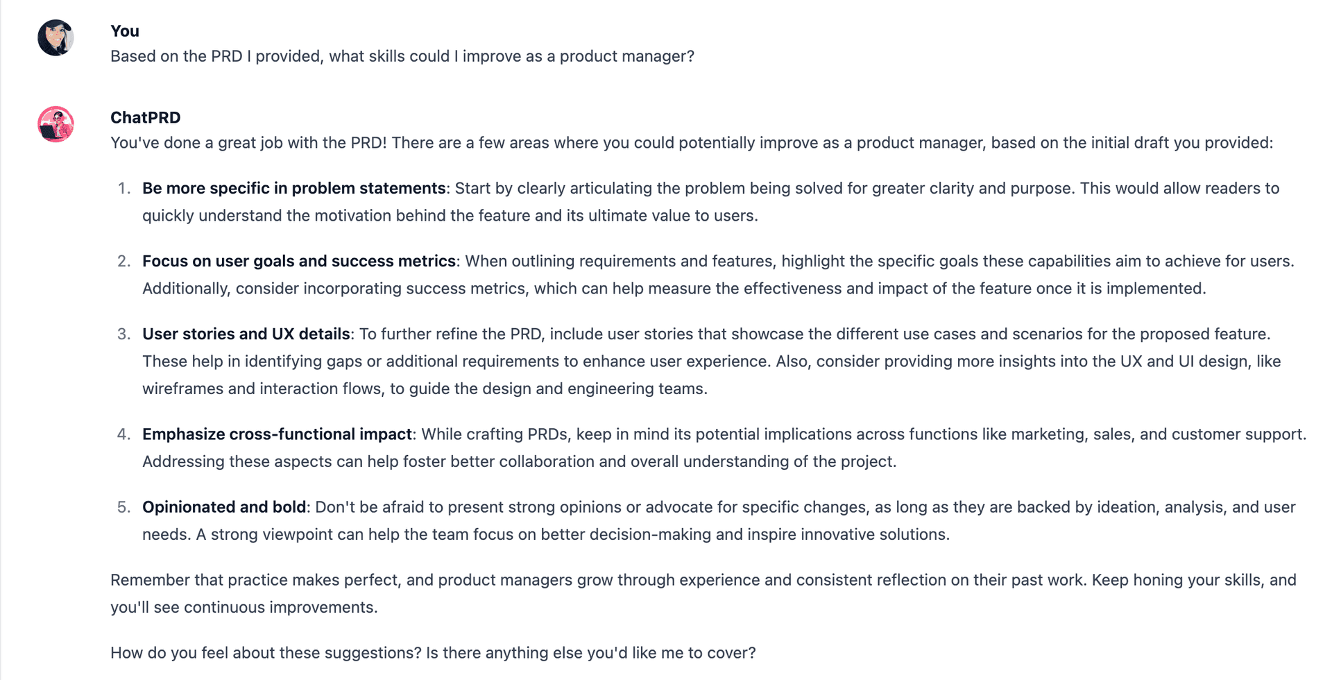 "Just want to say that I started using ChatPRD this morning for the first time and it's already saved me so much time. As an engineer that needs to write product specs now, this is just incredible."